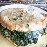 4. Add 3 ounces of the cream cheese and sour cream to the skillet and stir until spinach is coated and the cheese is completely melted. Season with salt and black pepper, to taste, and remove from heat. Let cool slightly before stuffing each pork chop with an equal amount of the spinach mixture, removing all of the spinach mixture from the pan in the process.