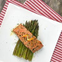 4. Arrange asparagus around the salmon filets in a single layer and place sheet pan in pre-heated oven. Bake for 15-18 minutes, or just until the salmon is flaky and the asparagus develops a bit of color, being careful to not overcook the salmon.