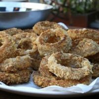 Meanwhile, prep the onion rings. Working with 1 at a time, dredge in the flour, shaking off excess. Dip the rings in the buttermilk mixture, allowing excess to drip back into the dish (I took Josie of Pink Parsley’s advice and used a fork for this step). Drop the rings in the crumb mixture and turn them to coat evenly. Transfer rings to a large platter or baking sheet.