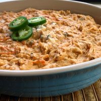 3. Remove lid and garnish dip with remaining blue cheese, sliced green onions, or jalapeno, if desired. Keep warm and serve with celery stalks and carrot sticks.
