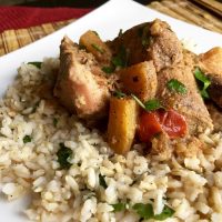 6. To serve, spoon warm pork and pineapple mixture over a bed of cooked brown or cilantro-lime rice. Top with the juices or thickened sauce, if desired, and enjoy!